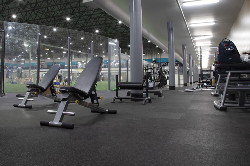 REGUPOL aktivplus is a 1/2" thick, high-density performance floor designed to withstand heavy traffic and high-impact. It is ideally suited for ice rink walkways, benches, locker rooms, training, and fitness areas. Thick and dense enough to support weight racks, strength equipment, and Olympic lifting stations commonly found in player development spaces. When paired with REGUPOL Crash Drop Zones, the system allows for flush, inlaid lifting platforms that maximize usable space, enhance athlete safety, and simplify daily cleaning and maintenance—an important consideration in rink environments.