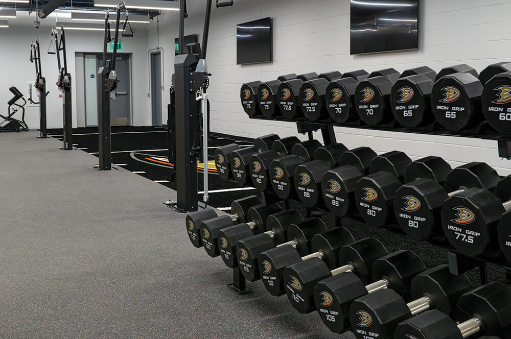 REGUPOL aktivplus is a 1/2" thick, high-density performance floor designed to withstand heavy traffic and high-impact. It is ideally suited for ice rink walkways, benches, locker rooms, training, and fitness areas. Thick and dense enough to support weight racks, strength equipment, and Olympic lifting stations commonly found in player development spaces. When paired with REGUPOL Crash Drop Zones, the system allows for flush, inlaid lifting platforms that maximize usable space, enhance athlete safety, and simplify daily cleaning and maintenance—an important consideration in rink environments.